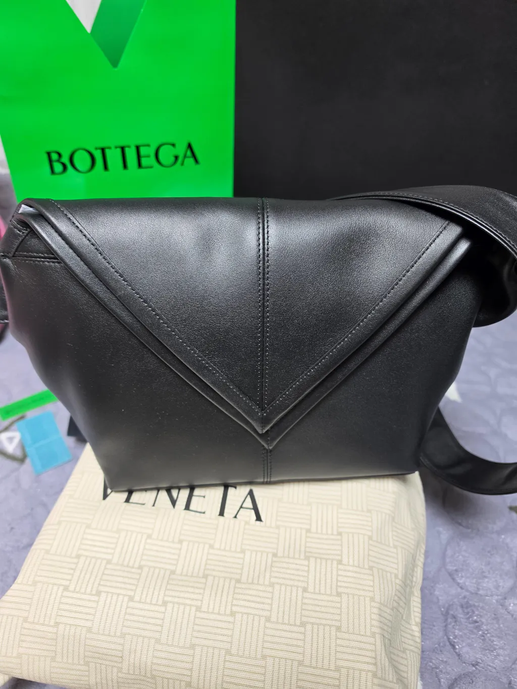 삼각형 쉐입이 너무 독특해서 첫눈에 반했어요. 일반적인 사각형 가방보다 훨씬 세련된 느낌이고, 스트랩의 매듭 디테일이 보테가만의 감성을 제대로 살려줍니다. 무채색 코디에 이 가방 하나만 들어도 룩이 확 살아서 너무 만족스러워요!