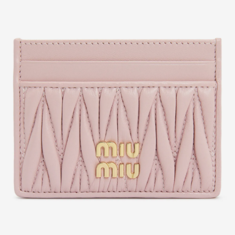 드러운 핑크 컬러의 마틀라쎄 레더에 골드 MIU MIU 로고가 포인트로 더해진 카드지갑입니다. 슬림한 디자인으로 카드 수납에 특화된 지갑입니다