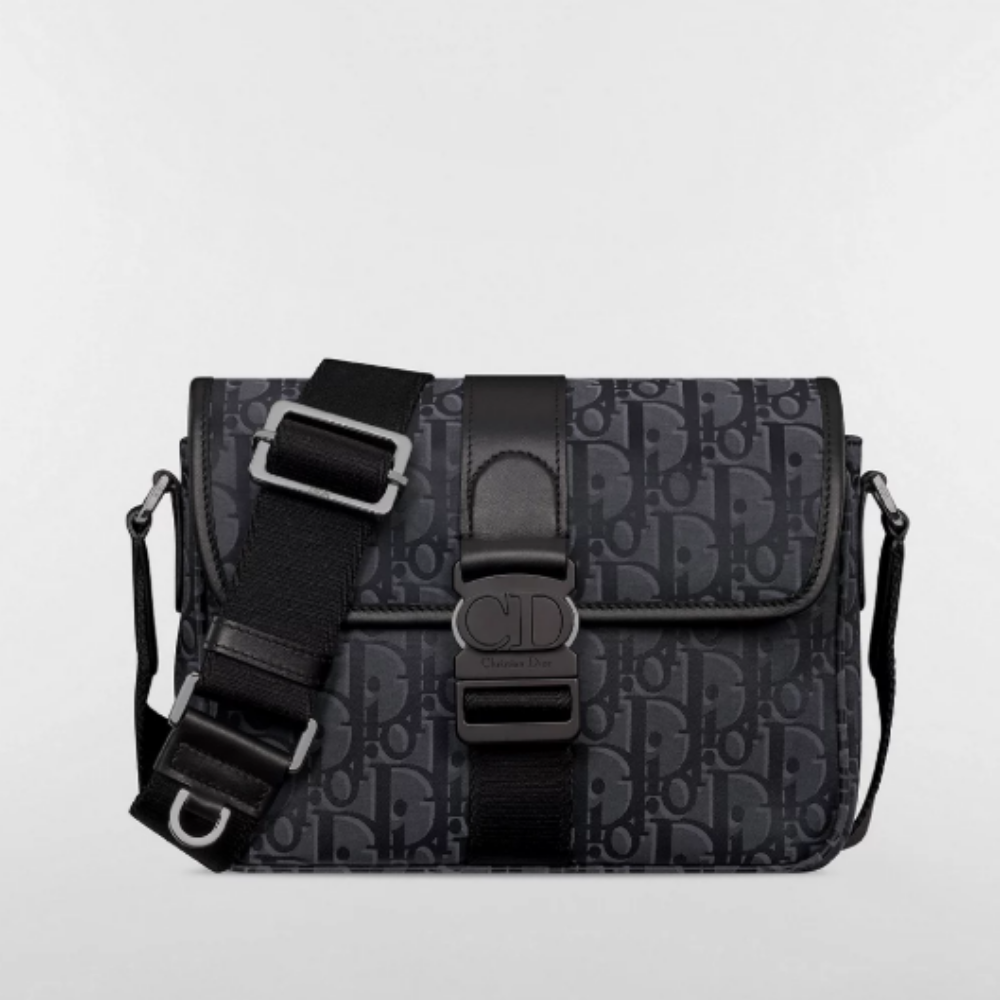 블랙 컬러의 Dior Oblique 나일론 소재로 제작되었으며, 알루미늄 CD 버클 디테일의 플랩을 열면 데일리 소지품을 모두 보관할 수 있는 넉넉한 내부 수납공간이 나타납니다